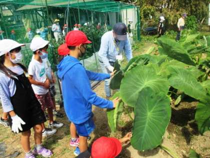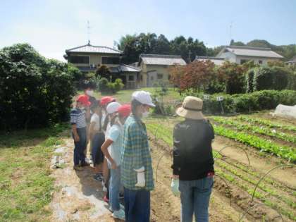 最後に畑で育てている他の野菜も見せていただきました。一生懸命お世話をした野菜はどれも生き生きとしていて,おいしそうでした。次回は,11月に「追肥」を行う予定です。
