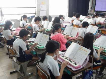 音楽の学習で,8分の6拍子を感じながら「風のメロディー」を歌ったり,手拍子のリズムを重ねながら「楽しいマーチ」をけんばんハーモニカで演奏したりしました。テンポを速くすると,手拍子がリズムにあわないところもありますが,みんなで手拍子とメロディーの重なりを楽しんでいました。