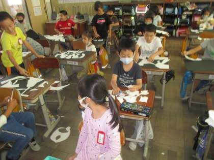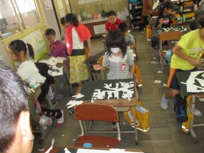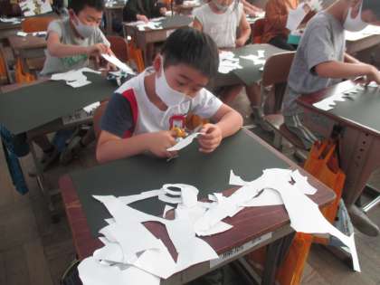 図工で「はさみのあーと」の学習をしました。白い画用紙を自由な形に切って,それを何かに見立ててテーマを決めて黒い画用紙に貼ります。はじめから何かの形を意図して切り抜くのではなく,ギザギザに切ったり,丸く切ったり,カーブをつけて切ったり,切り方を工夫していろんな形を作ります。