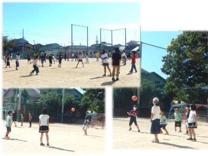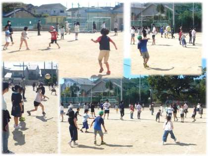 今日はニコニコタイムです。前回顔合わせをした「たてわりグループ」でドッジボールをしました。初めていっしょに遊びましたが,高学年の子ども達を中心に声をかけ合って,楽しそうにドッジボールをしていました。