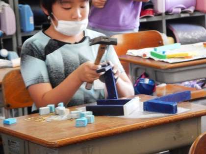 のこぎりで切り取った部品に色をつけて,釘を使って組み立てていきます。切り取った形からイメージを膨らませながら,組み立て方を考えたり,苦労しながら釘を打ったりしていました。