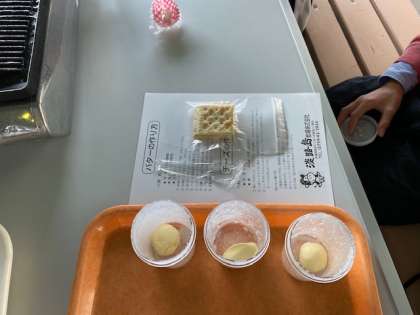できあがったバターはクラッカーにのせて,美味しくいただきました〜!