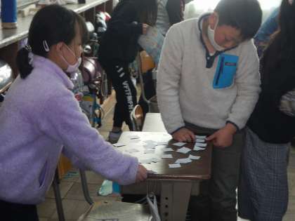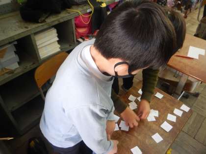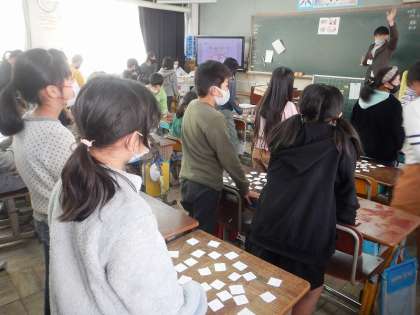 外国語活動の学習で,A!B!C!とアルファベットの学習をしています。順番に発音したり,アルファベットを探したり,並べ替えたりしながら,アルファベットに慣れ親しみました。