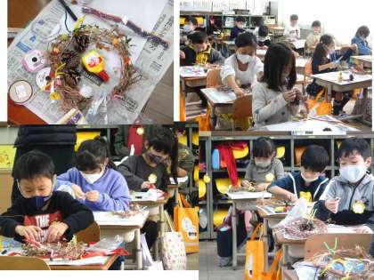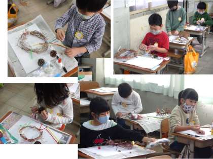 生活科「あきといっしょに」の学習で,アサガオのつるで作ったリースの上に,秋みつけで集めたどんぐりやまつぼっくりなどを飾って,クリスマスリースを作りました。並べ方やかざり方を工夫しながら,自分だけのリース作りを楽しみました。それぞれ違うかわいいクリスマスリースができあがりました。