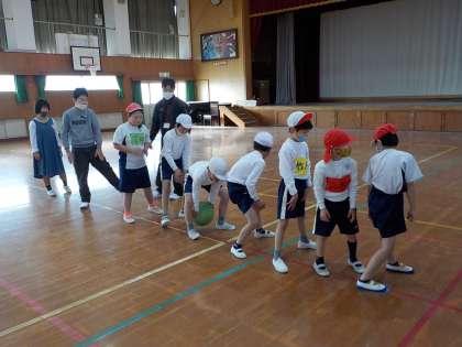 10人が一列に並んで,後ろの人へ股下からボールを送りました。