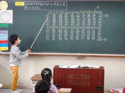 今回は,1から100までの数の表を見て,気が付いたことを発表していきました。「こんな風に変わっていっています。」と,たくさんの規則性を見つけていました。