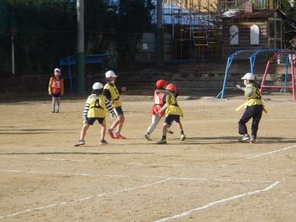 体育の「タグラビー」の学習も,練習を重ねるうちにルールもしっかり身に付き,上手にパスをしたりよけたりしながらトライを決めていました。守るチームも,どんな動きをすればタグが上手に取れるかを考えながら,しっかり守るなど,盛り上がる試合となってきました。