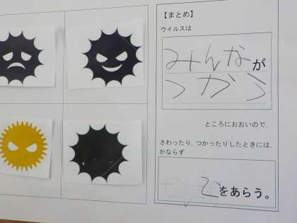 教室の中に隠されたウイルスのイラストを探す活動にも取り組みました。ロッカーや机,椅子など,みんなが使うところにウイルスがいることに気づき,改めて手洗いの大切さを感じることができました。