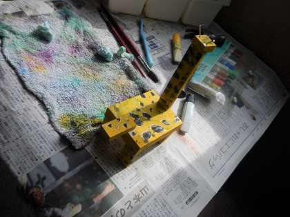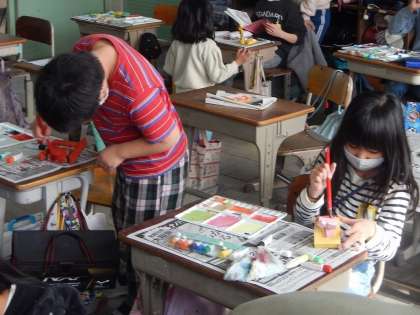 図工で取り組んでいる「くぎうちトントン」です。釘を打ち込んで作った作品に,今日は色をつけていきます。いつもは紙ですが,今回は木に絵の具をていねいにぬっていきました。