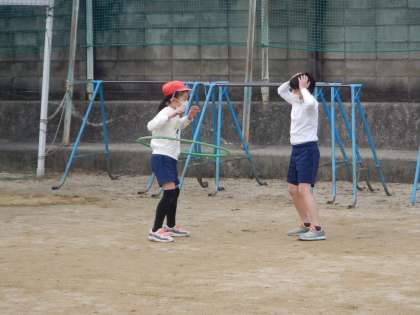 体育の学習で,フラフープや一輪車,竹馬など様々な用具を使った運動の仕方を体験したり,楽しさを味わいながら感じたことを友だちに伝えたりしました。実際に体を動かしながら,どんどん上手な体の使い方を見つけていました。