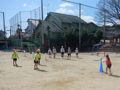 「打つ」「走る」「とる」といったベースボール型の学習をがんばっています。打つ方も守る方もチーム全員がしっかり考えて活動できるように工夫をしています。ゲームを見守る審判もしっかりがんばっていました。