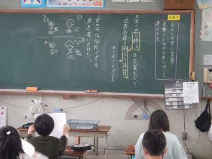 読点(,)のつける場所によって文章の印象が変わるように,主語や術後,文の長さが変わるだけで,分かりやすさが変わってきます。今日はどんな風に文章を変えれば,より分かりやすくなるのかをみんなで考えていきました。