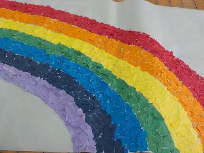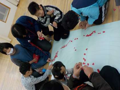 ぐしゃぐしゃにした画用紙を,今度は細かくちぎって,みんなで貼っていきました。