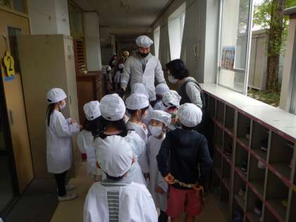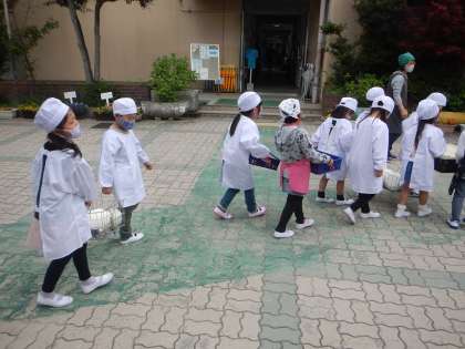 エプロンを着て,手洗いや消毒をしっかりして,給食室から給食を運びます。お友だちと協力しながら,教室まで気を付けて運びます。