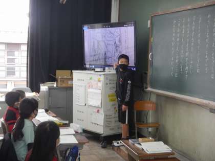 国語の学習で,谷川俊太郎さんの詩「かんがえるのっておもしろい」の場面の様子を考えました。1人1人想像をふくらませながら絵に表したり,友だちと交流したりしました。
