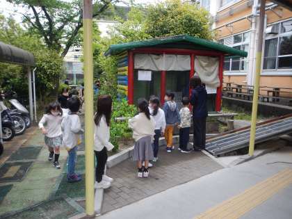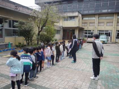 昨日は校舎の中を中心に探検しましたが,今日はなわとび広場や百年池など,校舎の外にある松尾小学校ならではの場所も探検していきました。あいにくの天気でしたが,雨も上がり,みんなで探検スタートです。
