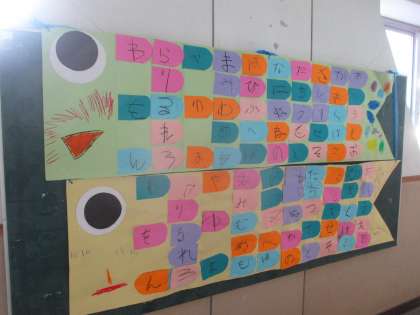 みんなで分担して,ひらがなカードを完成させて,こいのぼりのうろこにしました。