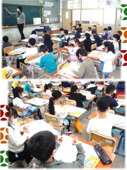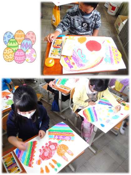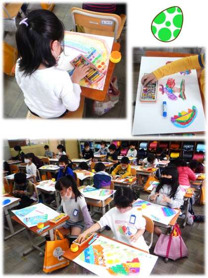 図工の学習で取り組んでいる「びっくりたまご」です。それぞれ自分のイメージに合ったたまごが完成し,今回はそのたまごの中からどんなものが飛び出してくるのかを画用紙にいきいきと描いていきました。びっくり!の言葉の通り,ドドーンといろいろな思いが飛び出していました。