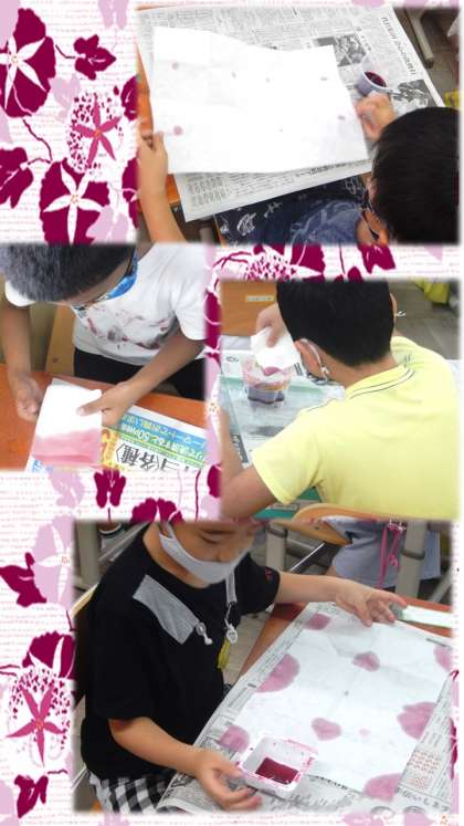 生活科の学習で育てているアサガオの花を使って,色水づくりに挑戦です。袋に集めておいたアサガオの花をていねいにもみ,しぼって,きれいな色水を作っていきました。できた色水には,和紙をつけて,いろいろな模様づくりも楽しみました。