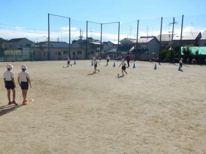 体育で取り組んでいる「サッカー」の学習です。ボールを味方に正確にパスをする練習をしたり,自分でドリブルしながら進む練習をしたりしています。これから,チームで協力しながら,ゲームもがんばっていきたいと思います。