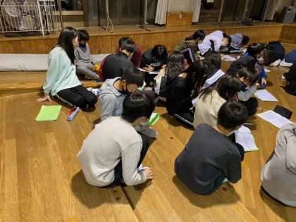 係単位で振り返りをしたり,班単位で話し合ったり,今日の反省を生かし、明日はより良い活動になりますように!