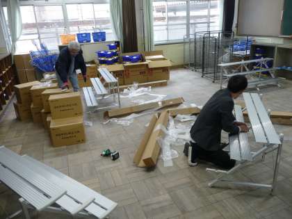 交換する準備に,事務職員さんと用務員さんが新しい花壇を組み立ててくれています。
