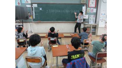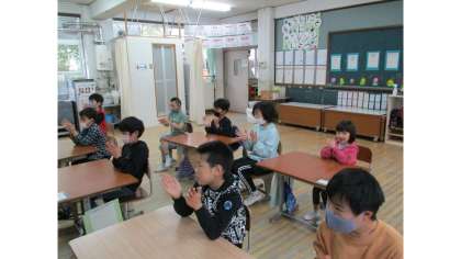 音楽では,毎回4拍子や3拍子に合ったリズムを両手で打つ学習をしています。