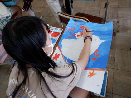 図画工作科の学習では「愛鳥週間ポスター」に取り組みました。羽の重なり方や,色づかいに気を付けながら,丁寧に作業を進め,美しい鳥の絵を描くことができました。