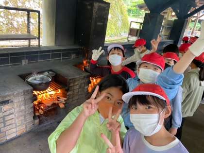 お昼ごはんは自分たちでつくるすき焼き風煮です。食器やおなべ、道具を洗って、食材をきって、準備が整ったら、火にかけます!良い火がおこってますよ!