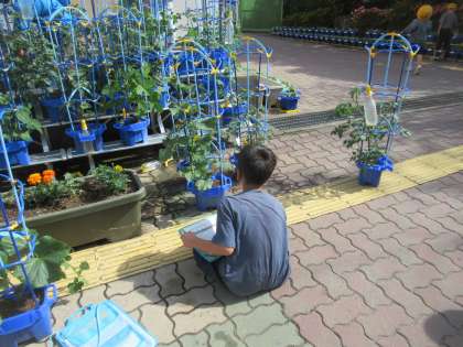 自分の植木鉢に植えた野菜に,毎朝水をあげている2年生。自分の野菜が,元気なかどうか,野菜の健康観察カードに様子をきろくしました。野菜の様子や天気,水やりや草取りをしたかどうかも,しっかり記録し,生長の様子を観察しました。毎日,記録をかきます。
