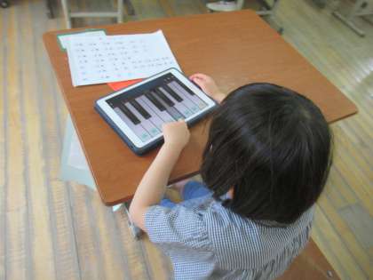 アイパッドの鍵盤機能を使って,鍵盤で音楽を演奏しました。先生の伴奏と子どもたちの演奏で合奏をすると,とても素敵な音楽になりました。
