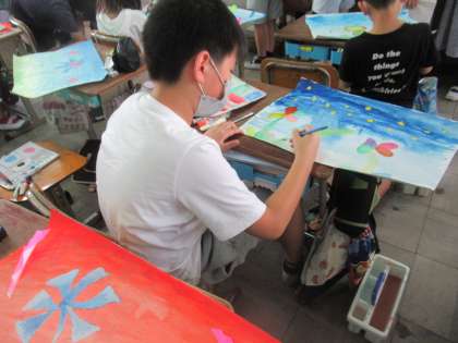 幻の花を想像を広げて描きました。髪を立体的に貼付け,工夫しました。教室は,一人一人の発想がすてきな作品でいっぱいになりました。