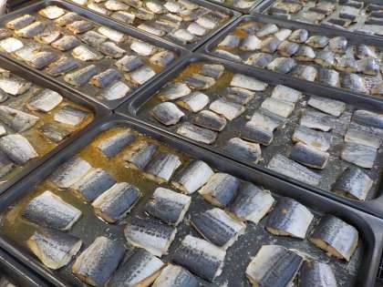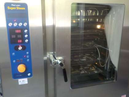 写真は,スチームコンベクションオーブンを使ってさわらを焼いている様子(2枚目)と,焼きあがった様子(3枚目)です。