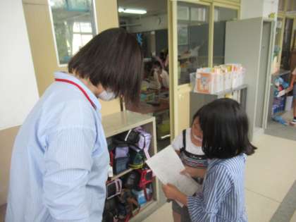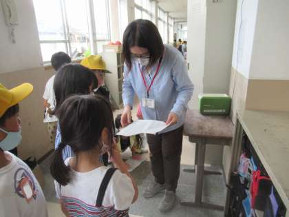 学校の職員の方や先生たちとも仲良くなりたいと考えた1年生。教職員の人たちに,アンケートを配りに行きました。アンケートに答えてもらうと,教職員の方々のいろいろな面を知ることができます。