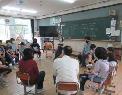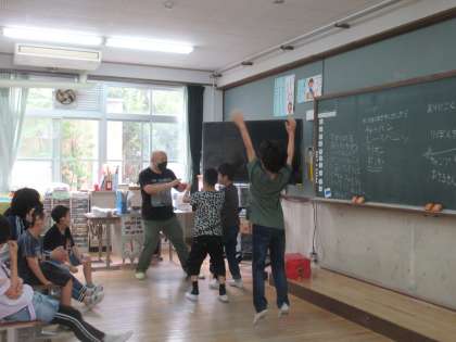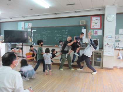 劇団の方が教室に来てくださいました。劇団の方と子どもたちで,「何をしているところか」を考える活動をしました。体いっぱいに表現すること,表現されたことを理解しようと,見つめて考えて伝えることが,とても楽しくて元気いっぱい笑顔いっぱい。楽しく活動できました。