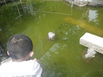 池を眺めながら「いろいろな色のメダカがいる」と不思議そうに池を眺める子など,みんなが楽しそうに生き物を探すことができました。
