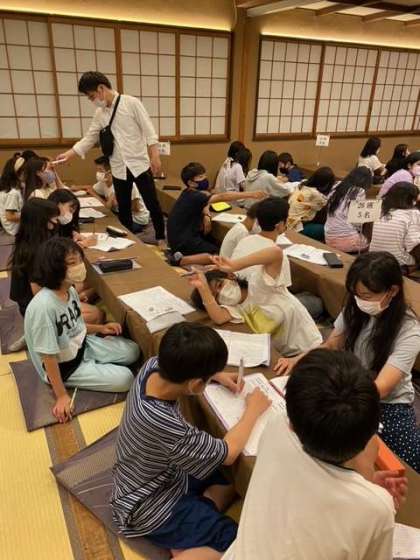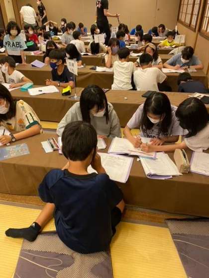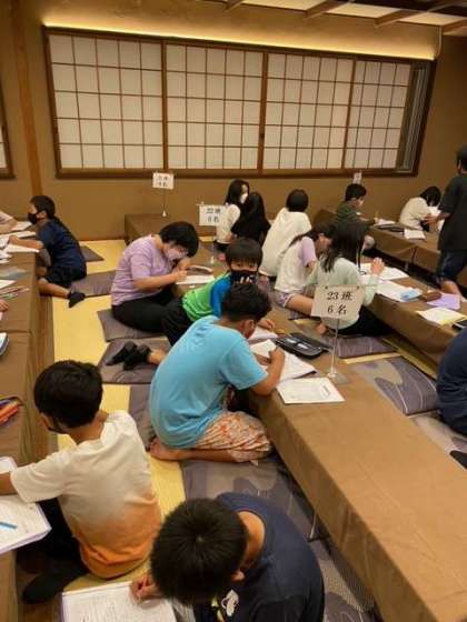 晩ごはんをいただいた大広間で班ごとに反省会をします。