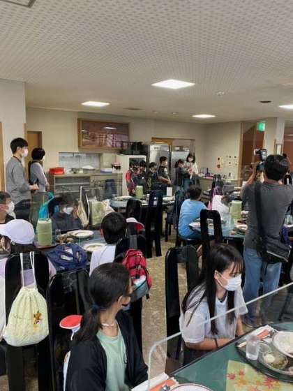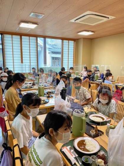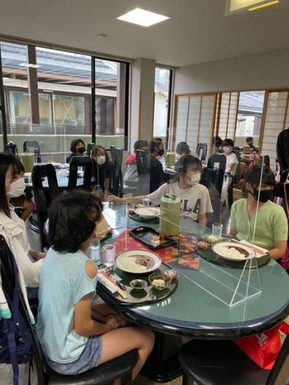 感染症対策として、大きなパーテーションをはさんでの食事です。