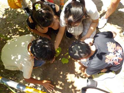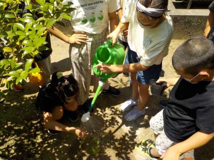 修学旅行で訪れた広島平和記念資料館より「被爆したアオギリ」から生まれた苗をもらいました。各クラスの代表委員が百年池のほとりに心を込めて植えました。これから、立派なアオギリの木になるよう、6年生全員で見守っていこうと思います。