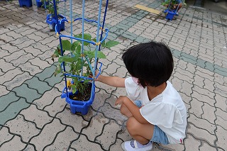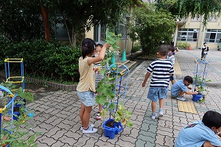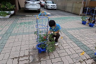 一生懸命水をあげて,健康観察をした自分の野菜。どんどん実が実り,子どもたちから「今日,収穫したよ。」と教えてもらうこともあります。その野菜に,肥料を入れました。自分より背が高く育ったきゅうりを喜んで,友だちに教えている子ども,新たな実ができてじっくり観察する子ども,「収穫しようかな」とつぶやいている子どもなど,いろいろな姿を見せていました。