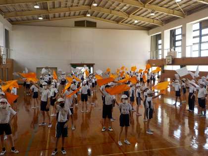 マツリンピックの練習で、初めて旗を持ちました。旗を持つとみんなのやる気も倍増。とても楽しそうに練習していました。シルバーとオレンジの旗が合わさってとても奇麗でした。