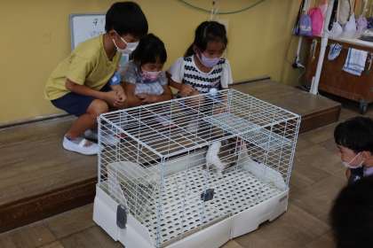 生活科の学習で、学校のウサギさんと子どもたちが出会う場をつくりました。ウサギさんは、大きな声や音を怖がるので、1年生の子どもたちは、ウサギさんが怖がらないように静かに静かにして、やさしく見守りました。「かわいい〜」という子どもたちの小さなつぶやきが、あちらこちらから聞こえてきました。ウサギさんを見る子どもたちの姿が、とてもやさしく、小さな生き物を慈しむ思いやりに満ちていてすてきでした。
