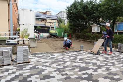 なわとび広場のインターロッキングの工事がすすみました。どんどんきれいになる地面に、子どもたちもわくわくしているようです。