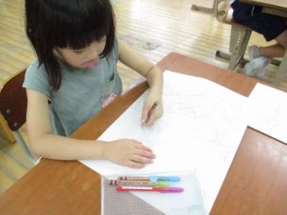 目の向きをはじめ、腕やひざの曲がり方を意識しながら、ていねいに紙に描いていました。