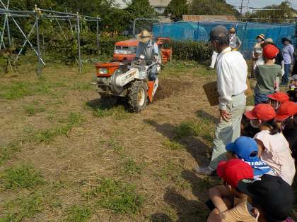青首大根を植える前には,どのように畝を作っているのかについてお話をいただきました。備中ぐわを使って畝を作っている様子を見せていただいたり,トラクターを動かしていただいて,広い畑ではどのように耕しているのかを見せていただいたりしました。子どもたちは「すごい!」「機械だと早い!」などと言って驚いている様子でした。