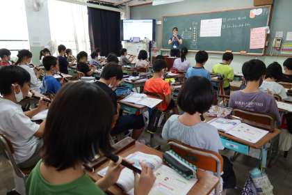スタッカートに気を付けて、「陽気な船長」の曲をリコーダーで演奏しました。先生と子どもたちで、2部に分かれて2部合奏をしました。違うせんりつを感じながら、楽しく演奏することができました。