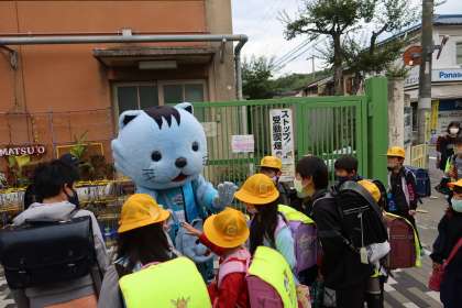 「大きい猫がいる!」「かわいいで!」次々と情報を伝えていく子どもたち。子どもたちはハンニャリンを囲みました。「おはようございます。」と、たくさんの子どもたちが、ハンニャリンにあいさつをしました。子どもたちは、とても喜んでいました。