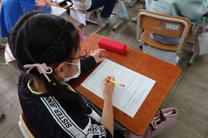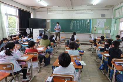 「たっくんといっしょに」という絵本を基にして、友だちと仲良くするために大切なことを考えました。みんな、一生懸命考え、発表したり考えを書いたりすることができました。最後の先生のお話で、とても思いやりのある行動に感動した子どもたちが「やさしい」と言って自然に拍手を先生おくる場面もありました。