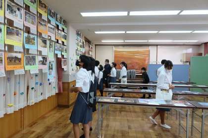 3年生が学校の150年を調べて、今の松尾を大切おもい、未来に残すために写真を撮りました。いま、150周年記念として、「キラキラ写真展」という名のもと、展示しています。地域の方や、子どもたちが見に来ています。チャレンジ体験をする中学生も見てくれました。