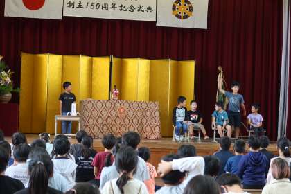 中学年の部での発表。聞いている3・4年生の子どもたちの態度も素晴らしかったです。はじめに、発表する3年生が、150周年記念のためにつくったオリジナルソングを歌うと、会場から手拍子が!